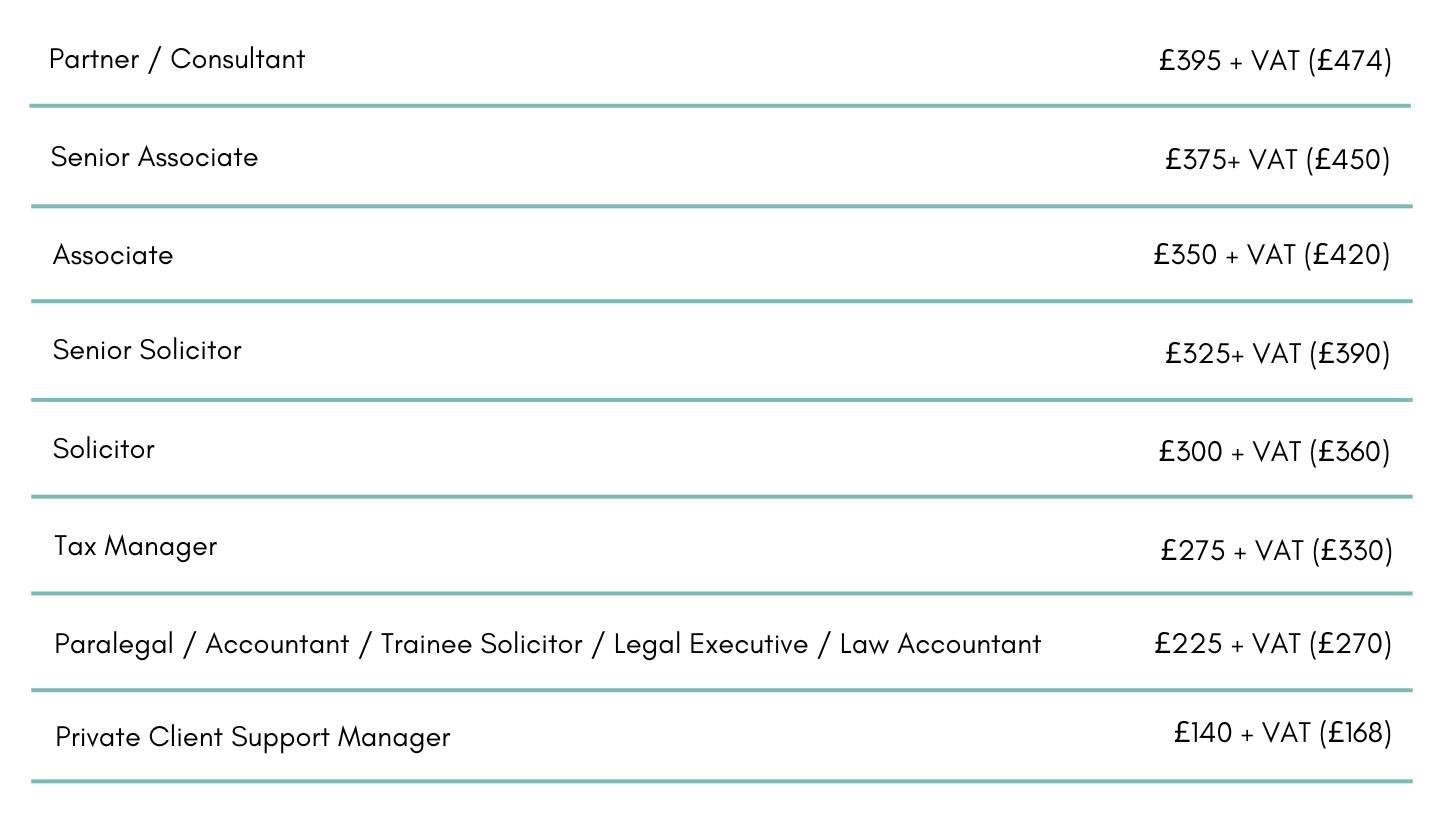 We can offer a fixed fee for straightforward smaller estates. For non-taxable testate estates with a gross value not exceeding £175,000 which consist of only a house or flat (or share of a house or flat), furniture and personal effects and cash held in bank accounts, our fixed VAT-inclusive fee is £3,250. Outlays are also payable (see below). For all other estates, our fees are calculated by reference to (1) the time we spend in dealing with the estate administration, based on the hourly charge-out rates noted below, and (2) the overall value of the estate – to reflect the additional responsibility of dealing with a higher-value estate. This element is charged at 0.5% of the gross value of the estate. There may also be a fee augmentation not exceeding 5% to cover incidental costs.Â